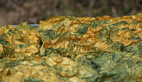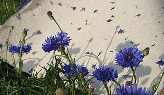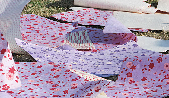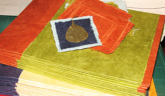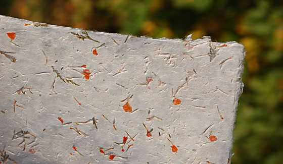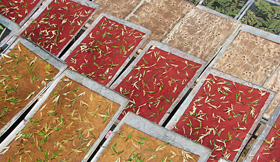Das säurefreie Papier wird in der Sonne getrocknet. Nach dem Färben, u.a. mit Naturfarben, werden die Bögen geglättet und erhalten dann im Siebdruck ihr einzigartiges Design oder werden mit Blüten und Blättern verschönert.